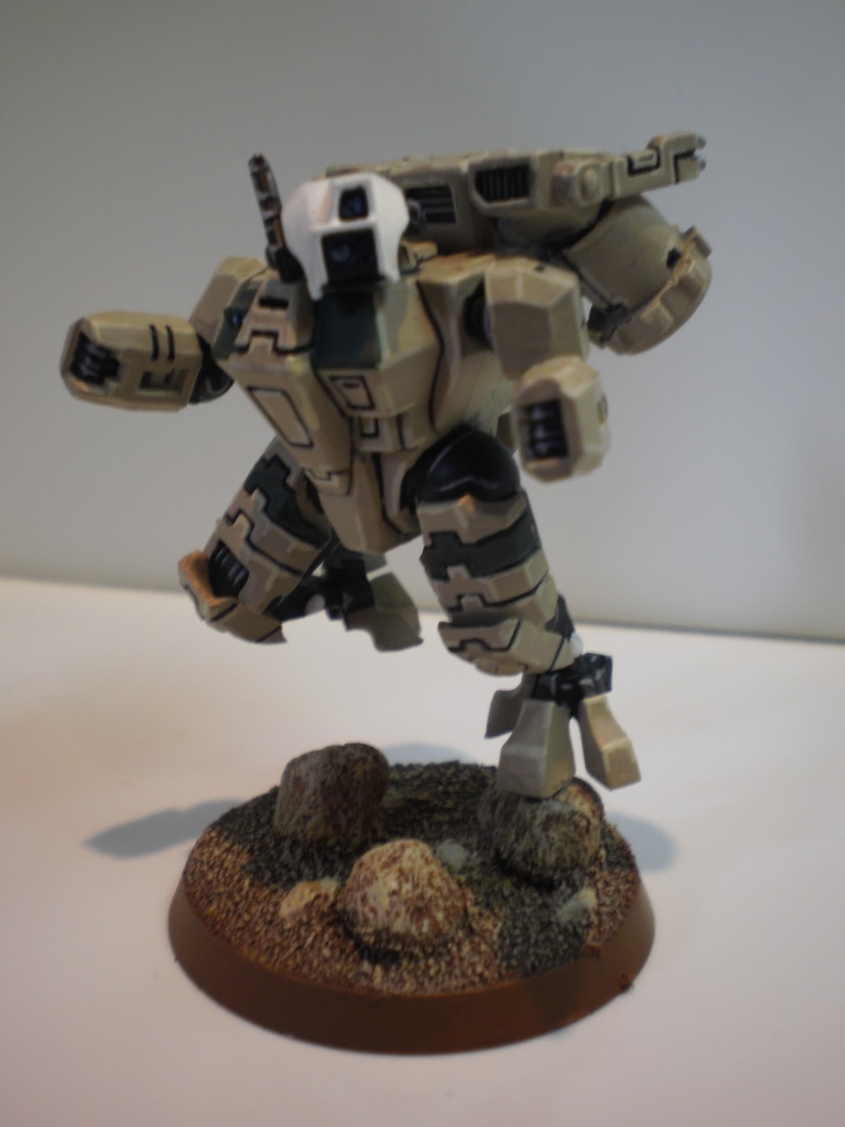 taken from a another project the client had found. So who ever thought of it, thank you. The suits were all reposed to give them a more dynamic look then the standard static look they normally have. Also the broadsides had the guns shortened down to be a little more compact and less likely to break. I though they looked better with the shortened guns. In addition to this all the weapons were painted and magnetized so that the client could try different weapon setup, this was a long process and took a lot of time to paint since they were all of the sprue, this made them hard to handle. The paint job was pretty much the same as all the previous parts of the project, Hammerfall Khaki from P3, Skull White and Dark Angels Green. Which were all highlighted with a brighter colour other then the white which was shaded using greys. The bases are made from stone and gravel and then painted in a desert style theme as you can see from the pictures. Another project complete and overall I am very happy with how it has turned out and the client was even happier with it, since it came out exactly how he wanted tit to look. Well till next time, and if you have any questions feel free to email me and I will do my best to get back to you. Keep checking back for more projects.